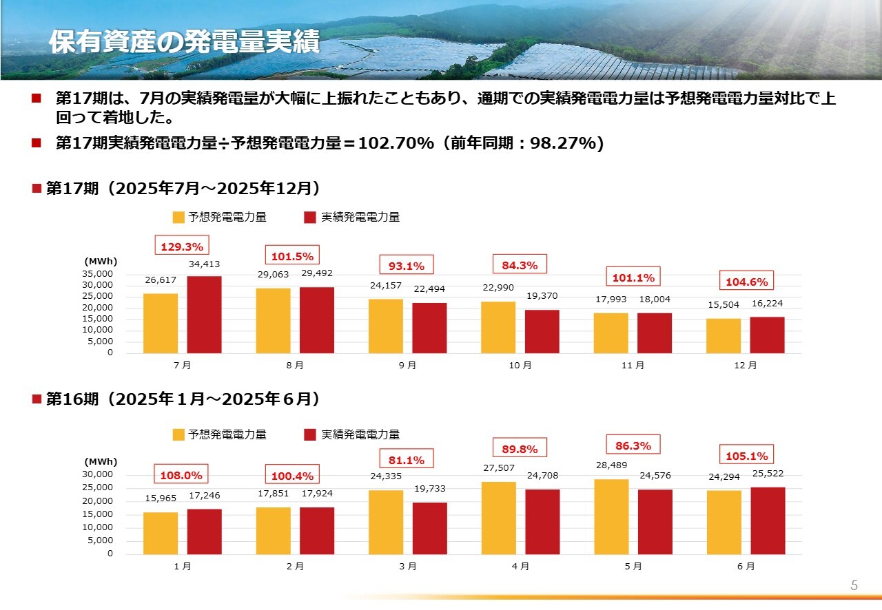 発電量の実績です。第17期は全般的に天候に恵まれ、日射量もおおむね良好でした。特に7月は実績発電量が大幅に上振れしたこともあり、通期の実績発電量は予想発電量比で102.7パーセントとなりました。