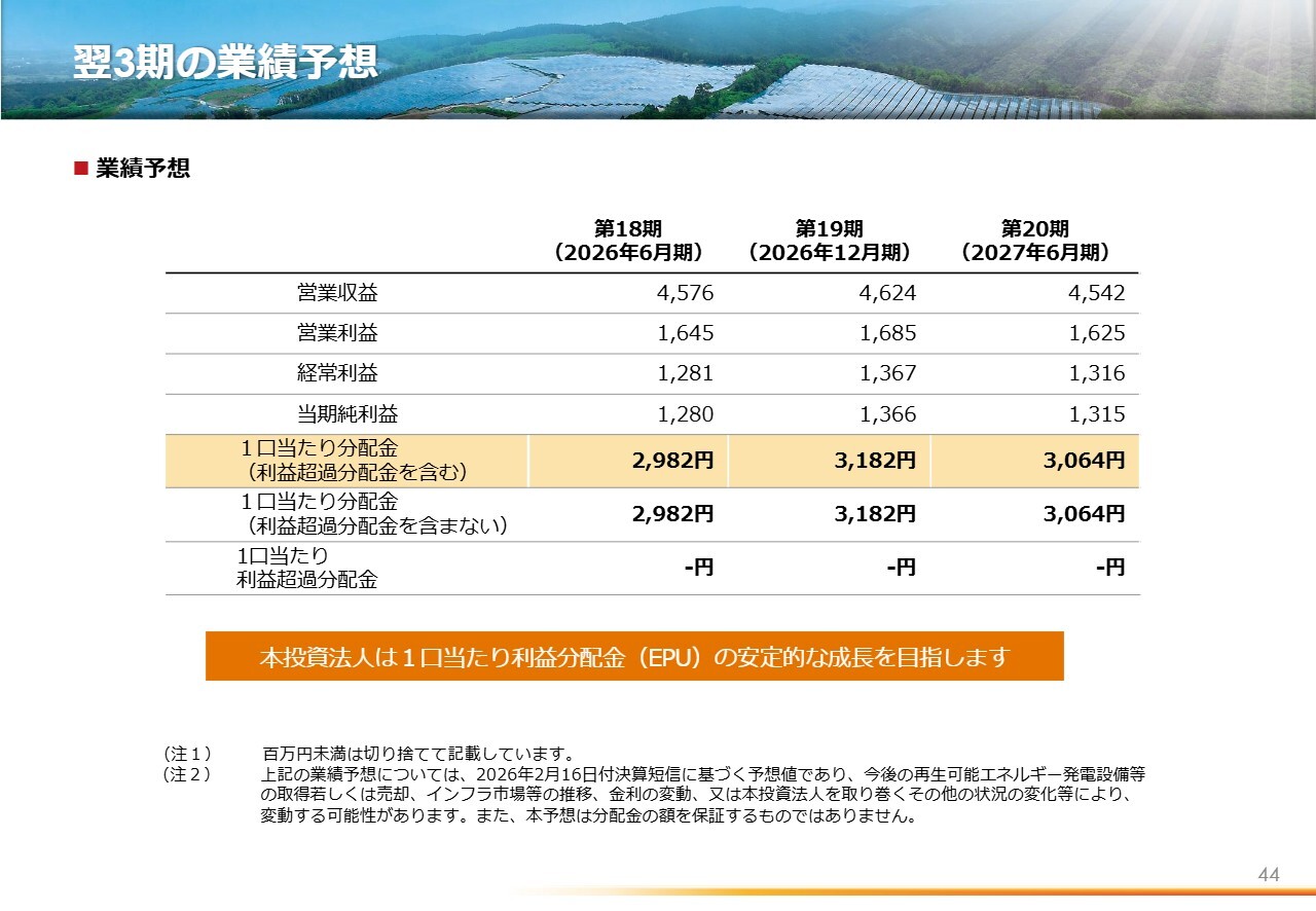 今後も各発電所の健全な運営に注力し、盤石な運用ポートフォリオによる長期的かつ安定的なリターンの確保と、1口当たり利益分配金(EPU)の着実な成長を目指します。