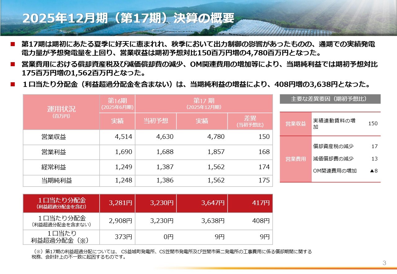 第17期(2025年12月期)の決算概要を、資料に基づきご説明します。当期の営業収益は47億8,000万円となり、当初の予想と比べて1億5,000万円の増収となりました。