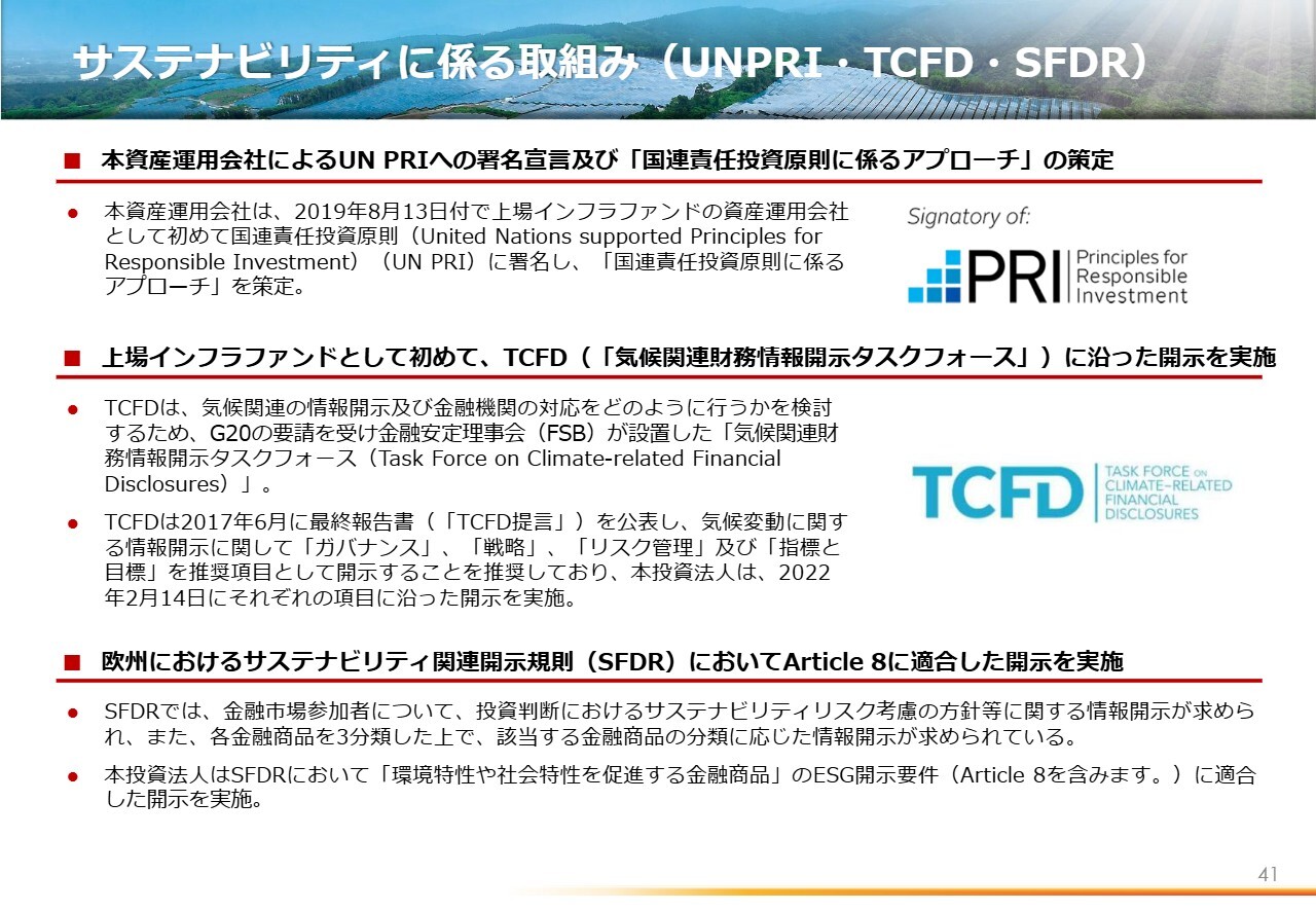 従来からの取組みとして、カナディアン・ソーラー・アセットマネジメントによる「国連責任投資原則(UN PRI)」への署名、本投資法人が上場インフラ投資法人として初めて実施した「気候関連財務情報開示タスクフォース(TCFD)」に沿った開示、さらに上場インフラ投資法人として唯一、欧州における「サステナビリティ関連開示規則(SFDR)」に適合した開示を行っています。