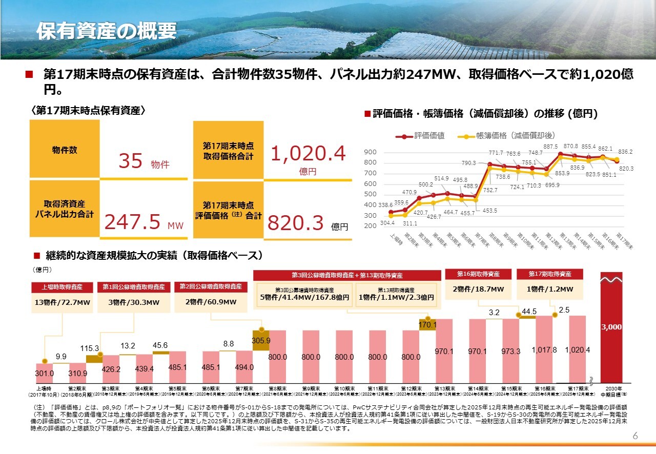 保有資産の概要です。第17期は、新たに1物件を取得しました。その結果、期末時点での保有資産は、発電所の数が35物件、パネル出力合計が247.5メガワット、取得価格合計が1,020億4,000万円、評価価格合計が820億3,000万円となっています。