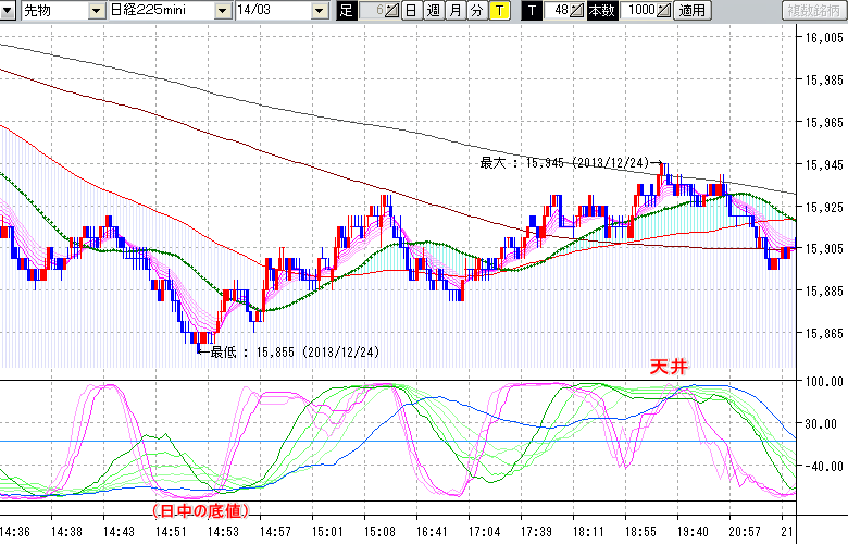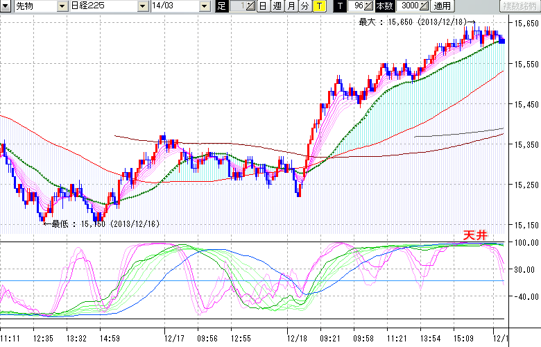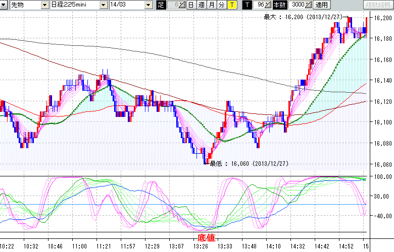 日経平均は ¥15,859.22 (+271.42) 3日続伸 ボリンジャーバンド(25日)は、+1.9 σ 225mini(3月限) 大引け ¥15,765 (+175) 東証一部の25日騰落レシオは 94.29東証一部の出来高は 28.6 億株 相場は大幅上昇。 出来高は20億株を大きく越えました。大引け後の先物の下げは不気味。ドル/円は 103円台後半。 -