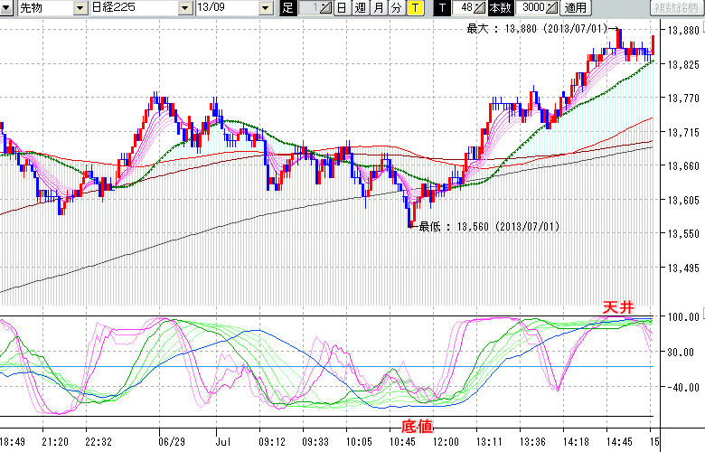 ★6/28 日中の株価の天底★ ↓クリックで画像拡大↓ ※指標ラインの密集点が天底・転換点を示します。指標の見方 日経225large先物チャート : 48ティック足 底値 : 13340 (6/28 09:... ...続きを読む -