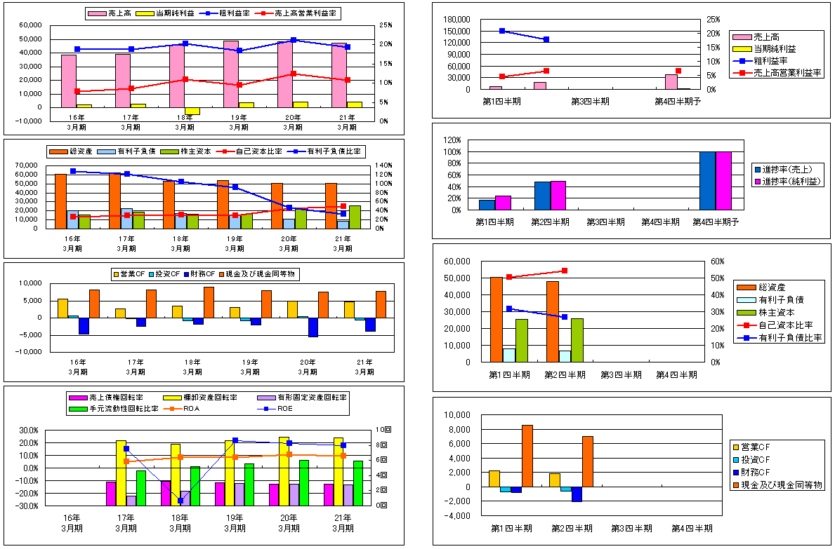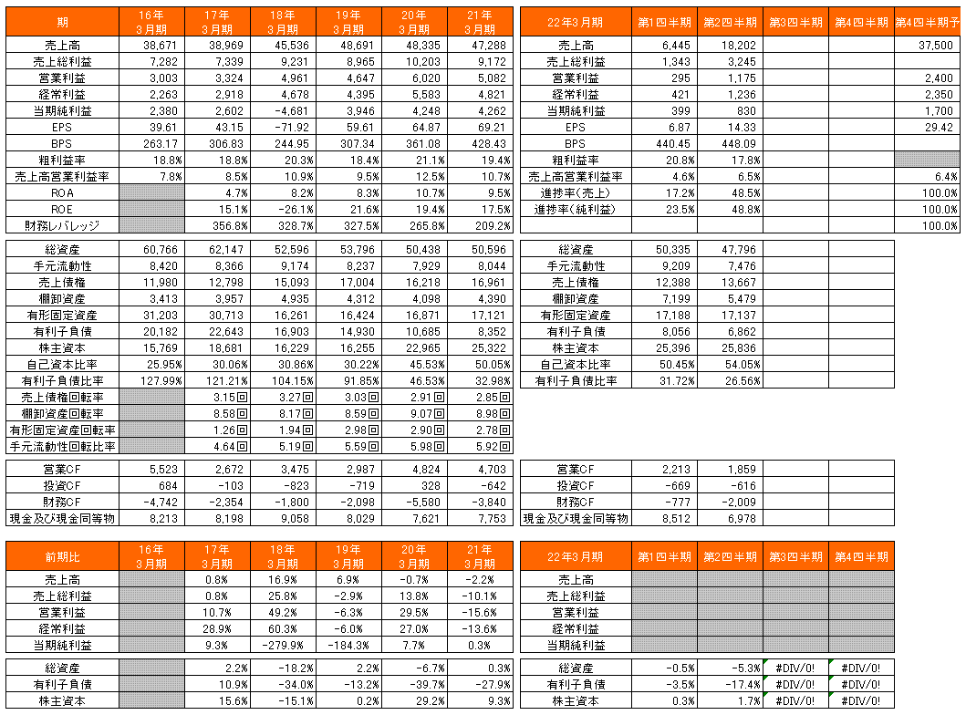 過去の経営成績を見ると、粗利益率は約18~21%で推移し安定している。売上高営業利益率も粗利率に左右され7~12%で推移している。ROAが17年3月期から比べると4.2%から約2倍以上となっており資産効率が格段にアップしている。特筆すべきは、有利子負債の削減か。16年3月期の有利子負債比率は127.99%であったが、21年3月期に32.98%まで削減している。安定した営業キャッシュフローのおかげだろう。