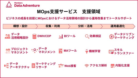「データ領域プロフェッショナル常駐サービス」を提供するデータアドベンチャーでは、データ専門人材によるマーケティング領域のデータ活用支援に関する多くの実績があります。この度、これらの実績を活用し、データ専門人材がMOpsにおけるデータ活用領域の設計から運用改善までトータルでサポートする「MOps支援サービス」の提供を開始します。本サービスによりマーケティング活動をデータドリブンし、効率化することで、企業のマーケティングチームが顧客や市場と向き合い、成果を出すことに専念できる環境を作ります。
