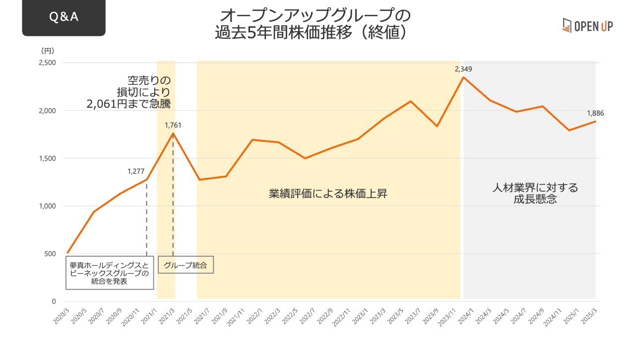 2024年年初からは、人材業界に対する成長懸念と利益率低下の懸念が市場に広がったことで株価は軟調に推移し、それが現在にまで続いています。具体的には、日本がインフレへ向かう転換点になったことで、人材獲得競争の激化や賃金上昇による利益率悪化の懸念があります。また、当社のようなグロース銘柄ほど成長懸念のインパクトが強かったと考えています。