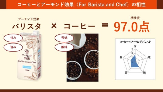「アーモンド効果 砂糖不使用」とコーヒーの相性診断の結果は95.5点、「アーモンド効果 For Barista and Chef」とコーヒーの結果は97.0点とさらに良い点となりました。コーヒーの苦味・酸味とアーモンド効果の甘味・旨味が相乗効果でおいしさを引き出すことができ、コーヒーと「アーモンド効果」は相性が良いと実証されました。