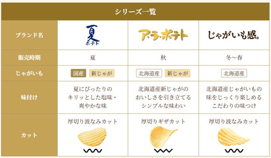 カルビーは、一年を通して国産じゃがいものおいしさをじっくり味わえる厚切りポテトチップスシリーズとして、「夏ポテト」「ア・ラ・ポテト」「じゃがいも感。」を季節にあわせて発売しています。