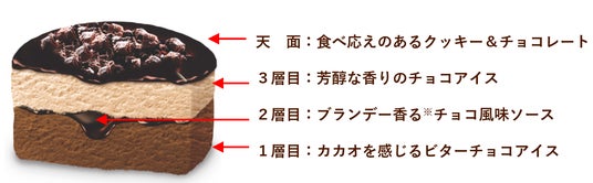 今年は天面のクッキーとチョコレートを10%増量し、食感が残りやすい製法のクッキーを使用することで食べ応えをブラッシュアップ。チョコレートの異なる味わいや食感をたっぷり楽しんでいただける“大人のためのチョコレート尽くしのアイス”に仕上げました。