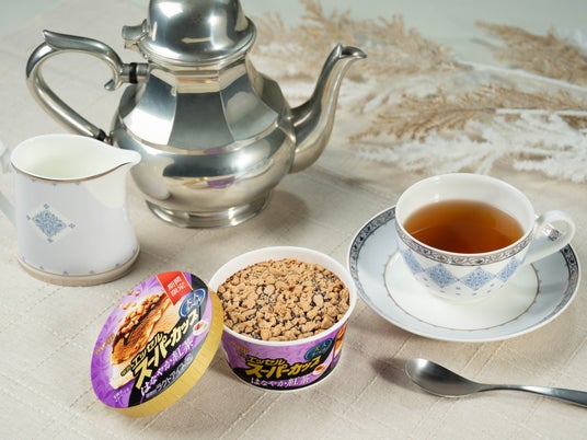 「明治 エッセル スーパーカップ 大人ラベル」シリーズ初のフレーバーとして登場した「はなやか紅茶」。1層目と2層目のアイスにはアッサム由来の原料を使用し、茶葉と乳原料のバランスを変えることで異なる味わいを表現しました。3層目の紅茶ソースには、隠し味としてウイスキーフレーバー※を使用。より一層華やかな味わいに仕上げ、天面にはダージリン由来の原料を使用したクッキーを敷き詰めました。