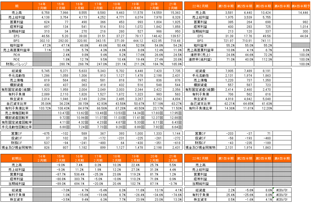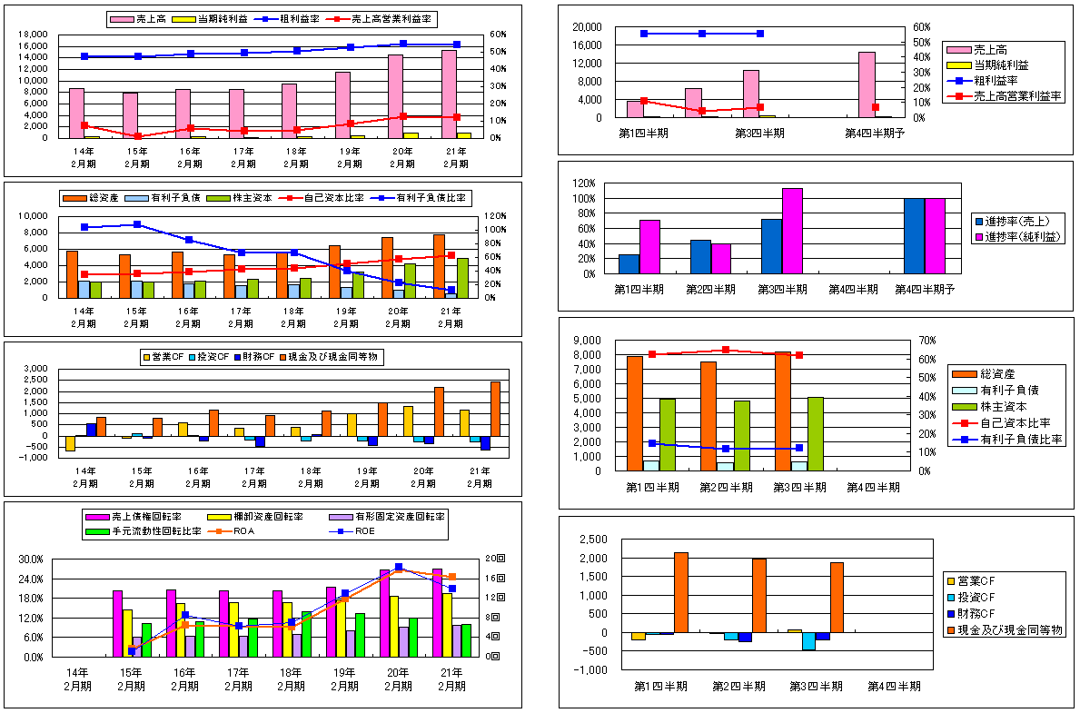 現状、予想PER14.3倍、PBR0.85倍、予想ROE5.94%、予想配当利回り4.76%+3,000円の株主優待券、自己資本比率は61.63%で有利子負債比率12.20%。進捗率を考えると、通期では売上高は未達、利益は上振れしそうだ。粗利率が55%台で推移すれば、今期の純利益は上方修正があるかもしれない。1月、2月は前年同期比で大きく売上が減少している。今後、安価な輸入品に対してどのように対抗していくか、どのように海外展開を推進していくのか楽しみです。