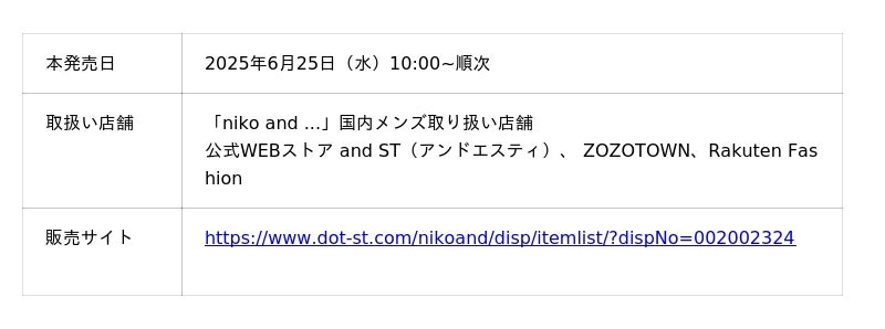 株式会社アダストリア(本部:東京都渋谷区渋谷2-21-1、代表取締役社長:木村 治)が展開するスタイルエディトリアルブランド「niko and ...(ニコアンド)」は、グローバルスポーツブランド「Kappa(カッパ)」との別注アイテム全3型を2025年6月25日(水)より全国の「niko and ...」メンズ取り扱い店舗と公式WEBストアand ST(アンドエスティ)などのオンラインストアにて販売いたします。