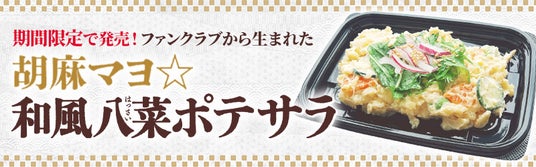 今回発売する「胡麻マヨ☆和風八菜ポテサラ」は、4~5月に行われたファンクラブの人気投票で3品の中から1位に選ばれた商品です。れんこん・ごぼう・にんじん・コーン・たまねぎ・枝豆・きゅうり・水菜、8種類の野菜をポテトサラダに使用し、見た目、食感、風味にこだわった商品です(詳細は下記ファンクラブサイト参照)。