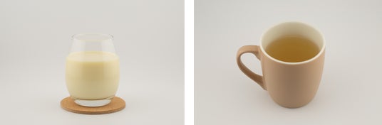 左豆乳で割った「免疫ケア にごり酢」 右「免疫ケア にごり酢」のホットドリンク