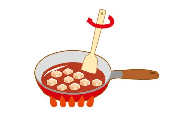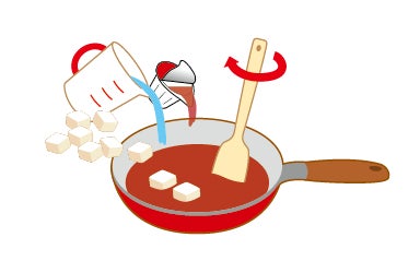 本品と豆腐、水をフライパンに入れ、静かに混ぜながらひと煮立ちさせます。