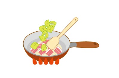 フライパンに油を熱し、豚バラ肉、キャベツの順に炒めます。