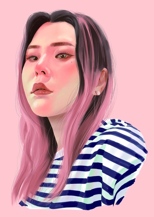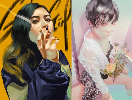 自分達の世代の価値観や共通認識をこの時代の証明として残したいと考え自分が実感できるリアルを同じ目線で描く。その為、自分と同世代の友人達をモデルにした作品が多い。絹にアクリルガッシュと墨で、透明感溢れる現代の強い女性像を描いている。