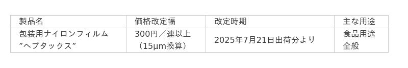 つきましては、お客様への安定供給の責任を果たすため、ナイロンフィルム製品の価格改定を行うことといたしました。