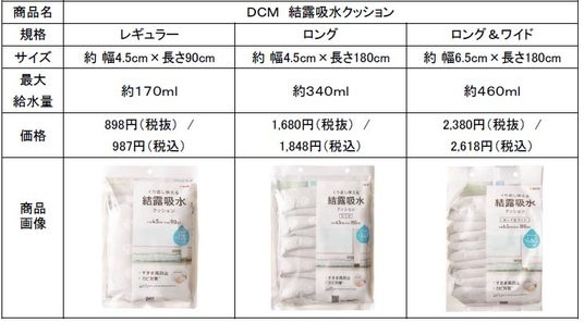 近年、住宅の気密性の高まりにより、窓に結露が出て、カビが発生するなど、結露対策についてのお問い合わせが増えてきています。昨年は窓の結露対策商品として「DCM 結露吸水クッション」を発売してご好評をいただいています。そのような中、お客さまより、幅広い窓に対応した商品や、より結露吸水量の多い商品が欲しいというご要望をいただいています。そこで、幅広い窓に対応したロングタイプとロングタイプで幅を約4.5cmから約6.5cmへ広げることで結露吸水量を約460mlに増加させたロング&ワイドタイプを追加して発売します。