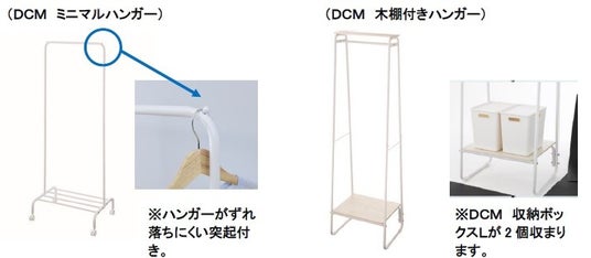 そこで、インテリアに馴染むホワイトカラーを採用しデザイン性を高めた「DCM ミニマルハンガーと「DCM 木棚付きハンガー」を発売します。収納力にもこだわり「DCM ミニマルハンガー」は下段に、DCM 木棚付きハンガー」は上段、下段に棚を配置しました 。下段の棚には「DCM 収納ボックス」がぴったり収まるサイズになっており、小物の収納にも対応しています。