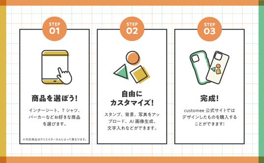 また、商品購入の都度クリエイターに収益分配されることはもちろん、購入者の自由な表現がクリエイターに新たなインスピレーションをもたらし、より豊かな創作活動の促進に繋がるなど、クリエイター支援の側面も持つサービスです。