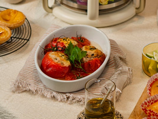 トマトを器に見立て、合い挽き肉とパルメザンチーズをたっぷり詰めて焼き上げた、見た目も味も華やかな一皿。