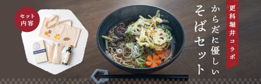 今回、数量限定で販売する「からだに優しいそばセット」は、ご自宅で簡単に老舗のそばの味わいを楽しめ、年越しそばとしてもお召し上がりいただけます。本セットは、「更科堀井」のお店で提供されている更科そばにより近い「半生更科そば」をご用意。また、セットの「やさしいつゆ」は、鰹節を使わずに本格的な江戸前の味わいを届けるというコンセプトをもとに不二製油グループと共同で開発されました。江戸前らしい力強い醤油の味と、鰹節のように醤油に負けない旨味と香り、ほどよい甘みが絶妙なバランスです。