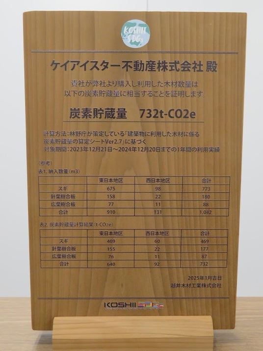 ケイアイスター不動産株式会社(本社/埼玉県本庄市、代表取締役社長/塙 圭二、以下「当社」)は、建築資材パートナーである越井木材工業株式会社(本社/大阪府大阪市、代表取締役社長/越井 潤、以下「越井木材工業」)より、2023年12月21日から2024年12月20日における二酸化炭素(CO2)固定量を732tとする認定を受けました。