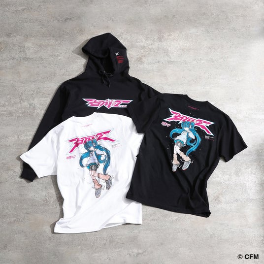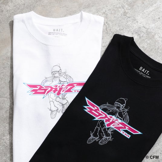 今回のコラボレーションアイテムは、オールドスクールなファッションに身を包んだ『初音ミク』に、トレンド感のあるサイバーパンク調のBAITロゴをあしらったデザインへアーティストPanchoが手がけました。2色のカラーバリエーションのTシャツに加え、フーディも同時にラインナップします。