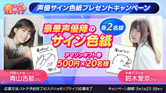「雀エボライブ」のキャラクターを演じる、青山吉能さん、鈴木愛奈さんの直筆サインがそれぞれ2名様に、Amazonギフト券が20名様に当たるキャンペーンを開催中です。