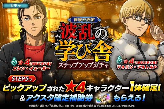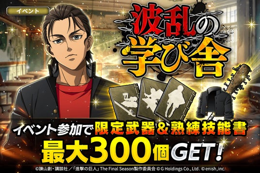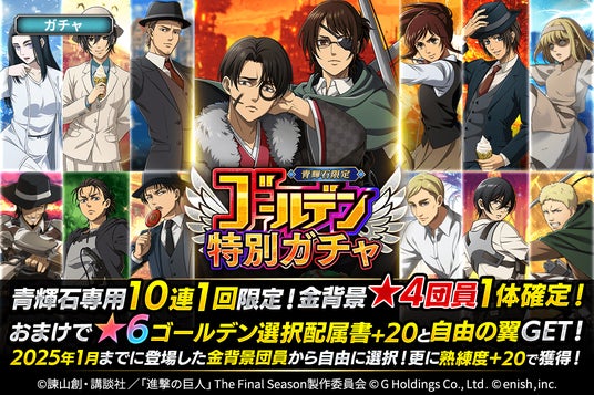 株式会社enish(本社:東京都港区、代表取締役社長:安徳 孝平、以下enish)は、アニメ『進撃の巨人』のスマートフォンゲーム最新作「進撃の巨人Brave Order」にて、2025年4月24日(木)より、ゴールデン大進撃祭を開催!今ならガチャなどに使用できる赤輝石が最大3,000個もらえちゃう!またゴールデン大進撃祭前半ミッションではライナーの特別な衣装、波乱の学び舎イベントでは育成素材の熟練技能書が最大300個がGET可能!その他、最新情報はゲーム公式サイト・ゲーム公式X(旧Twitter)アカウントにて随時公開して行きますので、ぜひご覧ください。