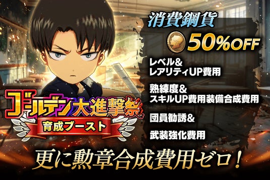 2025年4月24日(木)より、団員のLvアップやレアリティーアップなどの育成費用が半額になるゴールデン大進撃祭育成ブーストを開催!この機会に団員を強化し強敵に挑もう!