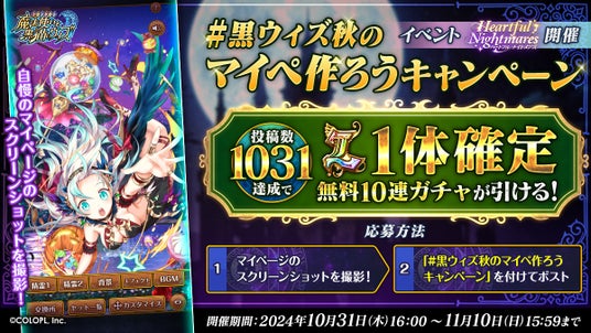 お気に入りのマイページを作成してスクリーンショットを撮影、Xで「#黒ウィズ秋のマイペ作ろうキャンペーン」のハッシュタグをつけて投稿しましょう! 皆で投稿数“1031件”を達成すれば、L1体確定無料10連ガチャを漏れなく全員にプレゼントいたします。奮ってご参加ください。