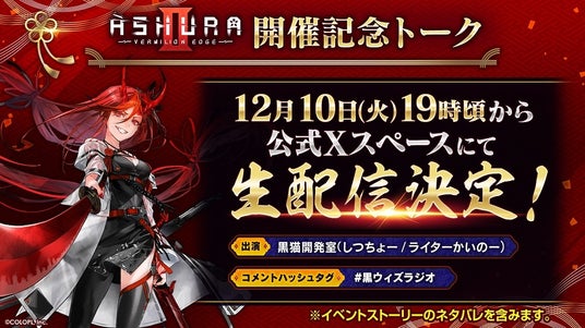 『黒ウィズ』公式Xスペースにて、黒猫開発室が「ASHURA:VERMILION EDGE」イベントシリーズについて語る生配信を実施いたします。専用のフォームより開発室への質問やお便りを募集しております。詳細は該当のポストをご確認ください。