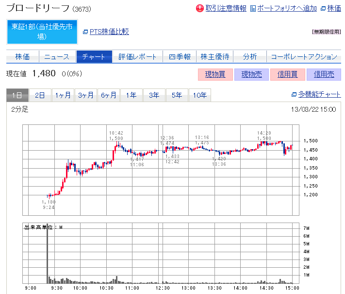 ふき値で売ったら再度5日線まで押し目まって買ぃ戻しヵな。 (UPDATE 1 :09:26) Bingo♪ブロードリーフ上場来高値更新やったね