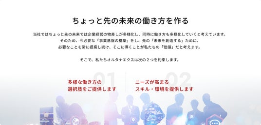 IT・Web業界を中心とした一般労働者派遣事業、有料職業紹介事業、SES事業を展開していた前身の株式会社Fittioから社名変更及び事業領域を拡大し、2024年1月1日に誕生しました。オルタナエクスでは、顧客向けに、今必要な「事業基盤の構築」をし、先の「未来を創造する」ために必要なことを常に提案し続け、そこに導くことが「価値」だと考えます。マーケター/エンジニア/クリエイター領域の専門スキルを有した人材供給と活躍できる環境提供の支援をします。