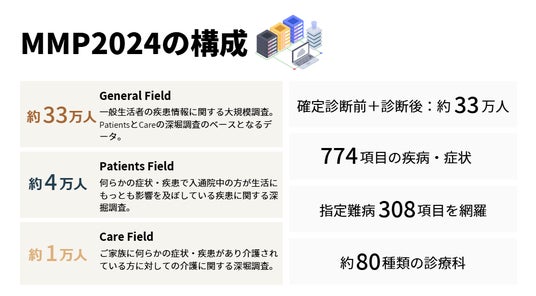 MMPは、大規模な疾患情報パネルであり、2018年から毎年30万~35万人の生活者が参加しています。特に、過去1年以内に入通院歴のある約10万人、入通院歴のない約23万人、さらに介護を行っている約1万人が含まれ、多様なヘルスケアの状況をカバーしています。