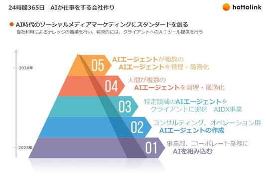 また、ホットリンクではこうした段階的なAI導入を5つのフェーズで整理しており、現在はフェーズ01「業務にAIを組み込む」の段階をおおむね達成。今後は、業務フロー上に最適化されたAIエージェントを設計・導入するフェーズ(フェーズ02)への移行を見据えています(下図参照)。