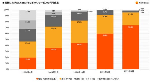 「毎日(週に5回以上)」利用している社員は73.9%で、前回(2025年1月)を大きく上回りました。「週に3~4回」も含めると、週3回以上利用している社員は全体の95%を超えました。