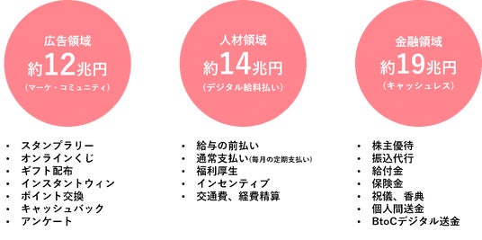 マーケティング(広告)領域・人材領域・支払いのDX(金融)領域の3つの領域を注力領域としてあげ、3万円以下のtoC向け支払いでのシェア拡大を目指し邁進しております。