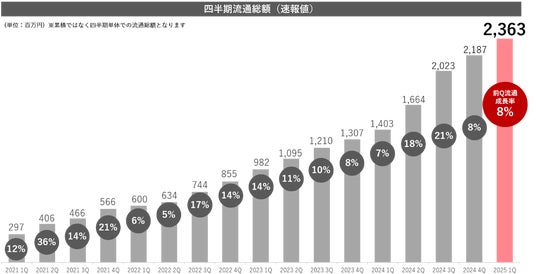 当社は、2027年9月期流通総額1,000億円の目標(※)に向けて、資金移動業の取得、デジタル給与払いの取得に向けた動きなど、サービスとしての品質向上、また、カスタマーサクセスによるクライアント満足度向上及び営業活動の強化を推進しております。結果として、2025年9月期第1四半期において流通総額が23.5億円(速報値)を突破、19四半期連続成長を実現いたしました。