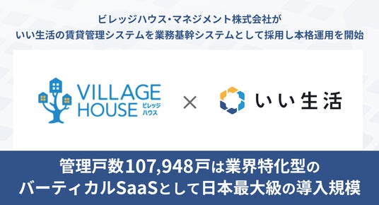 不動産業務を網羅するバーティカルSaaSと業務効率を推進するBPaaS(※1)で不動産市場のDXを推進する株式会社いい生活(東京都港区、代表取締役社長 CEO:前野 善一、東証スタンダード:3796、以下:いい生活)は、ビレッジハウス・マネジメント株式会社(東京都港区、代表取締役社長兼CEO:岩元 龍彦、以下:ビレッジハウス・マネジメント)に対し、不動産業務クラウド・SaaS「いい生活賃貸管理クラウド」の(※2)提供と本格運用が開始したことをお知らせします。