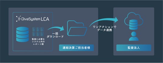 「DivaSystem LCA」を利用する連結決算ご担当者様が、監査調書の元データとなる決算データを一括出力し、高度なセキュリティ環境下にある監査法人のデータ受領サーバーへワンアクションでAPIデータ連携を行います。
