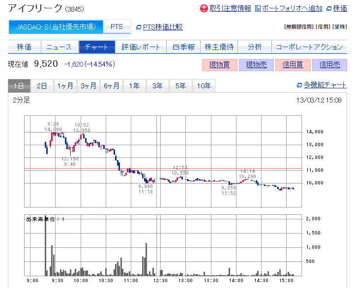 アイフリーク 14000円で少し売れましたヽ(・∀・)ノ自分の大損銘柄ですが一気にプラスになりましたヽ(・∀・)ノPTSではほんの少ししか売れず良かった(笑)これと日本通信は長期で持ちたいと思っています。上がれば売りますが・・・・