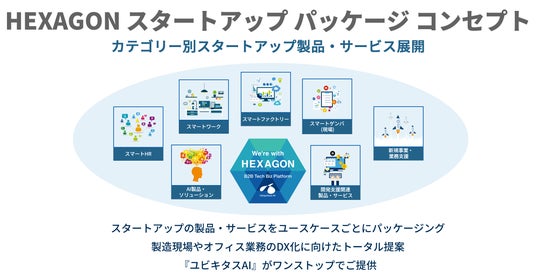 「HEXAGON スタートアップ パッケージ」は、用途に応じた多くのスタートアップが提供する製品・サービスをユビキタスAIが一つにまとめる(パッケージ化)ことで、1つの顧客課題を解決するだけでなく、顧客自身が気づいていない潜在的な課題も発見し、顧客の抱える多様な課題を総合的に解決するパッケージです。また、課題解決のために自社開発を行うと「完成まで時間がかかりタイムリーに解決できない」「エンジニア不足で進捗に遅延が出る」「開発投資による固定資産償却費用負担が発生する」などの課題が発生することがありますが、解決策となり得る製品・サービスを検証し、有効な製品・サービスを短期間で導入することができるため、新しい挑戦への敷居を下げることも可能です。
