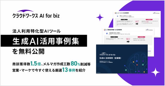 フリーランス業界No.1プラットフォーム(登録ワーカー600万人・登録企業100万社)を基盤に、IT人材&コンサルティングサービスを提供する株式会社クラウドワークス(本社:東京都渋谷区 代表取締役社長 兼 CEO:吉田 浩一郎 以下「当社」)が運営する法人利用特化型生成AIツール「クラウドワークス AI for biz」(以下「本ツール」)は、営業職・マーケティング職の皆さまの業務を効率化する「生成AI 活用事例集」(以下「本事例集」)を2024年12月9日に無料公開いたしました。