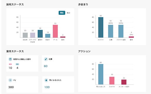 案件の応募状況やスカウトに対する反応数、採用率など、重要な採用指標をグラフで直感的に把握することができます。数値データだけでなく視覚的な情報により、採用チーム全体での情報共有がスムーズになります。複数の採用ポジションを同時に進行している場合も、採用の全体像を素早く把握できます。