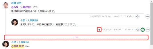 メニューダイアログ内にある[未読に戻す]をクリックすることでNewラインと未読マークが表示され、あとで読みたい時にどこから読めばよいかわかりやすくなります。