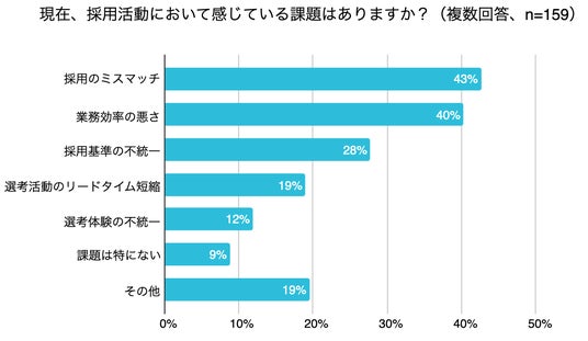 実際に、採用担当者に採用活動において感じている課題を聞いたところ「採用のミスマッチ(内定辞退や早期離職)」が43%で最も多い結果となっています。