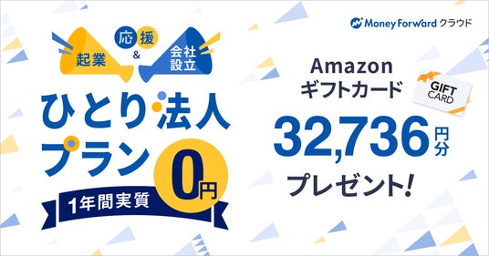 株式会社マネーフォワードは、『マネーフォワード クラウド』を1名でご利用になるひとり法人向けに、よりリーズナブルな価格で利用できる「ひとり法人プラン」を新設します。この度、本プランの新設に伴い、ひとり法人の事業者を応援するため「ひとり法人プラン 1年間実質0円※1特典」を提供し、基本料金1年分相当のAmazonギフトカードをプレゼントします。これにより、対象ユーザーは『マネーフォワード クラウド』を実質1年間無料で利用できます。
